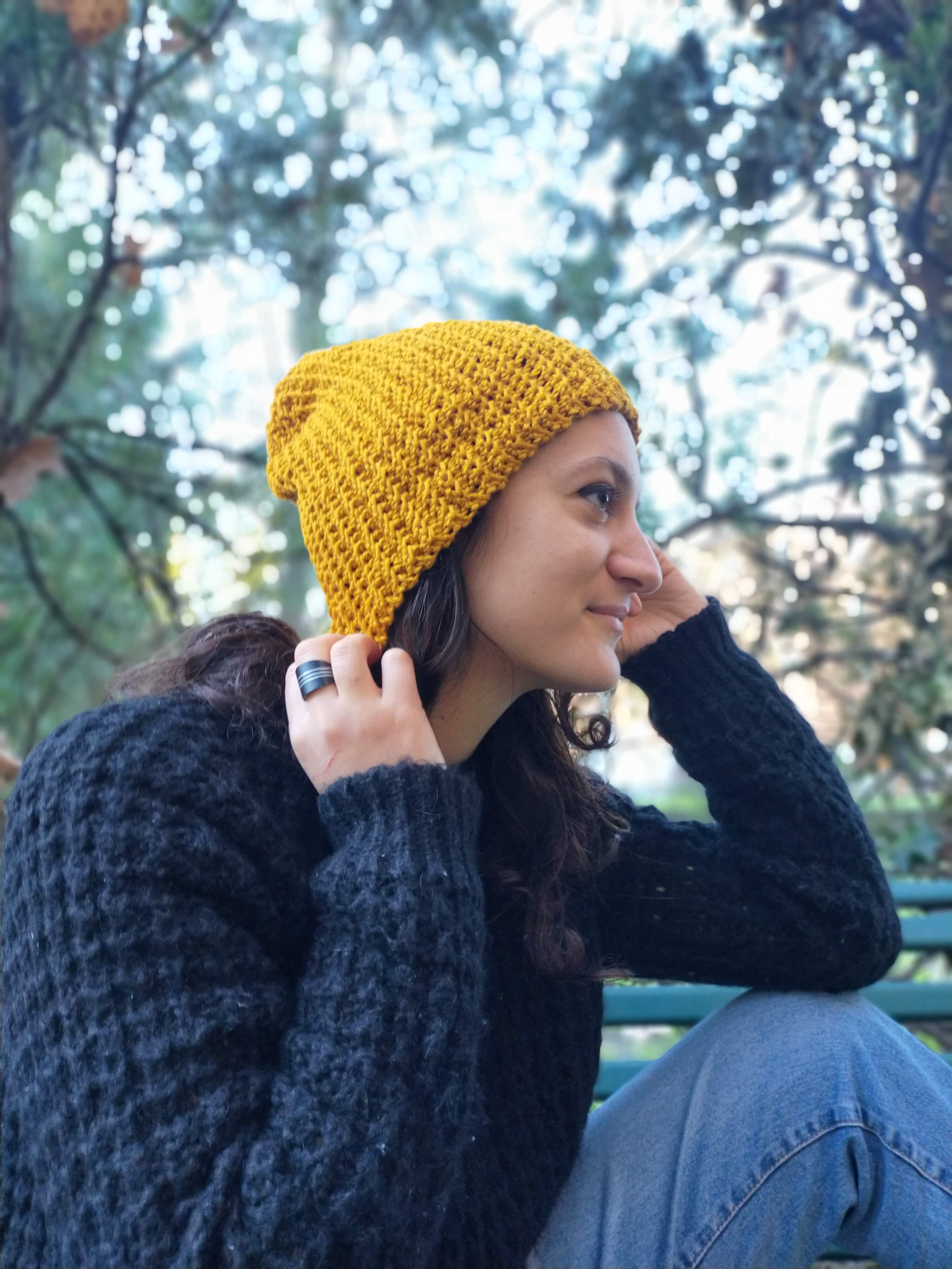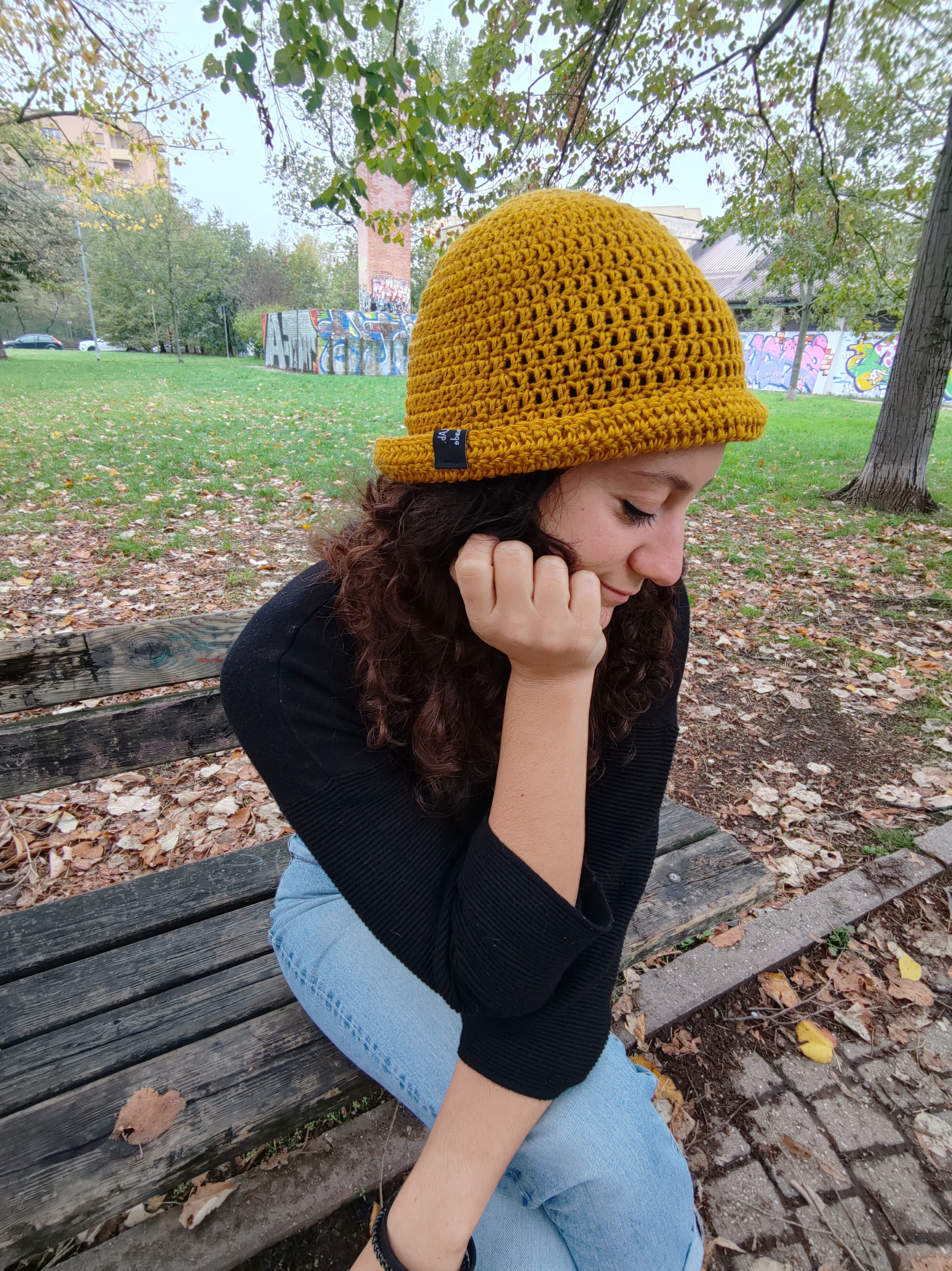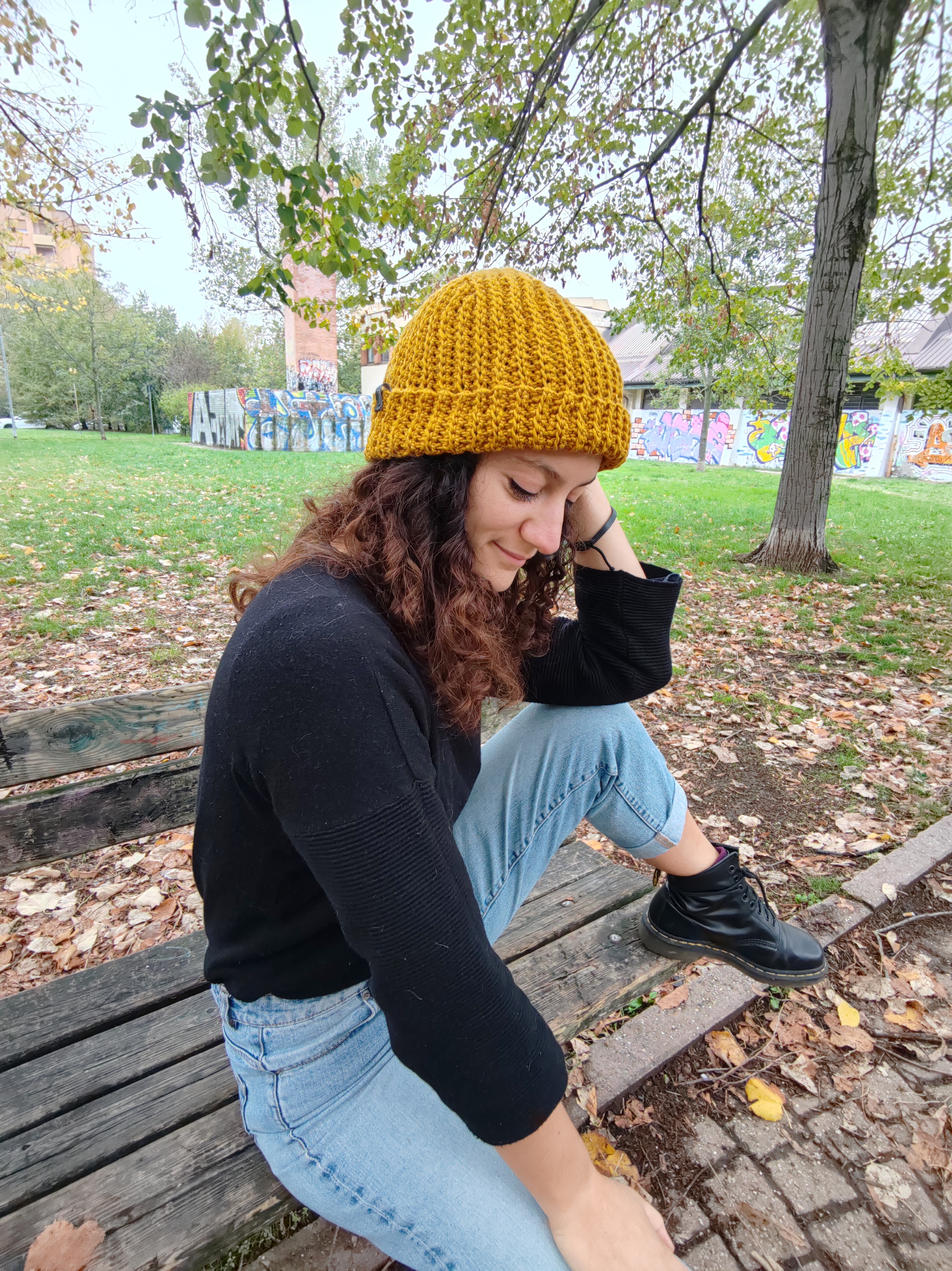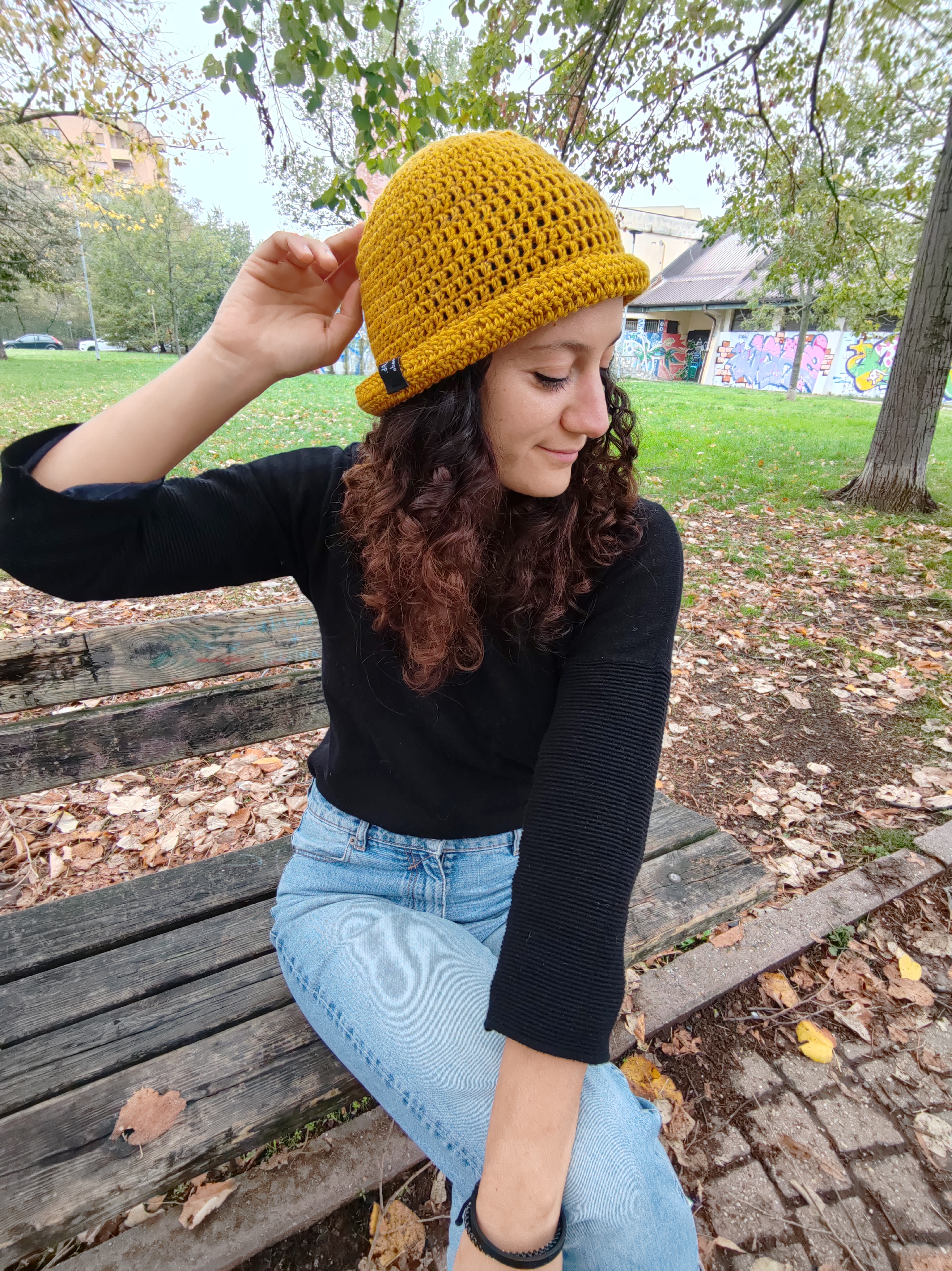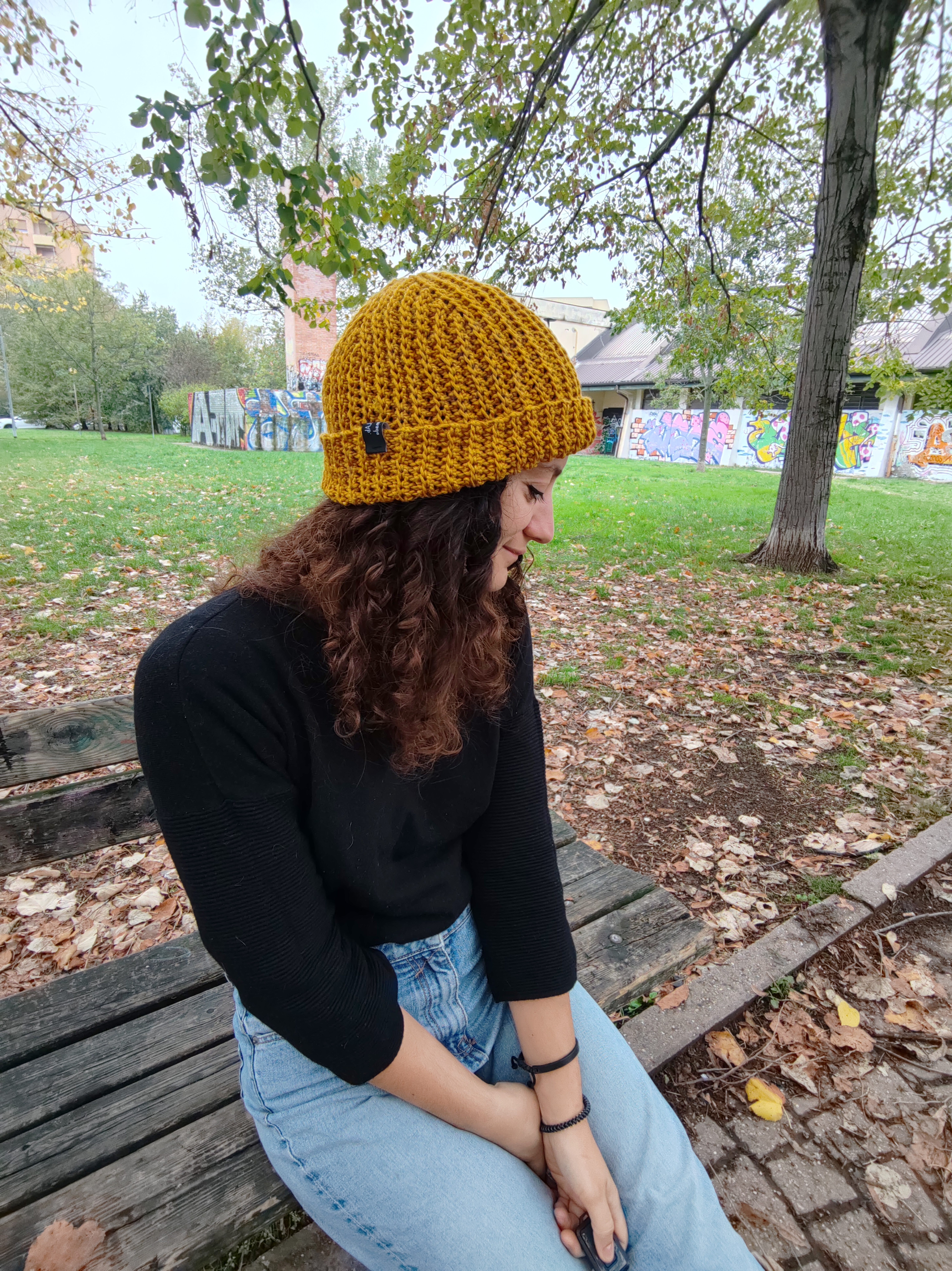 Cuffia color ocra, filato in misto lana e cotone. Puoi portarla con il risvolto per un effetto a classica cuffia, oppure senza per avere un effetto morbido dietro.