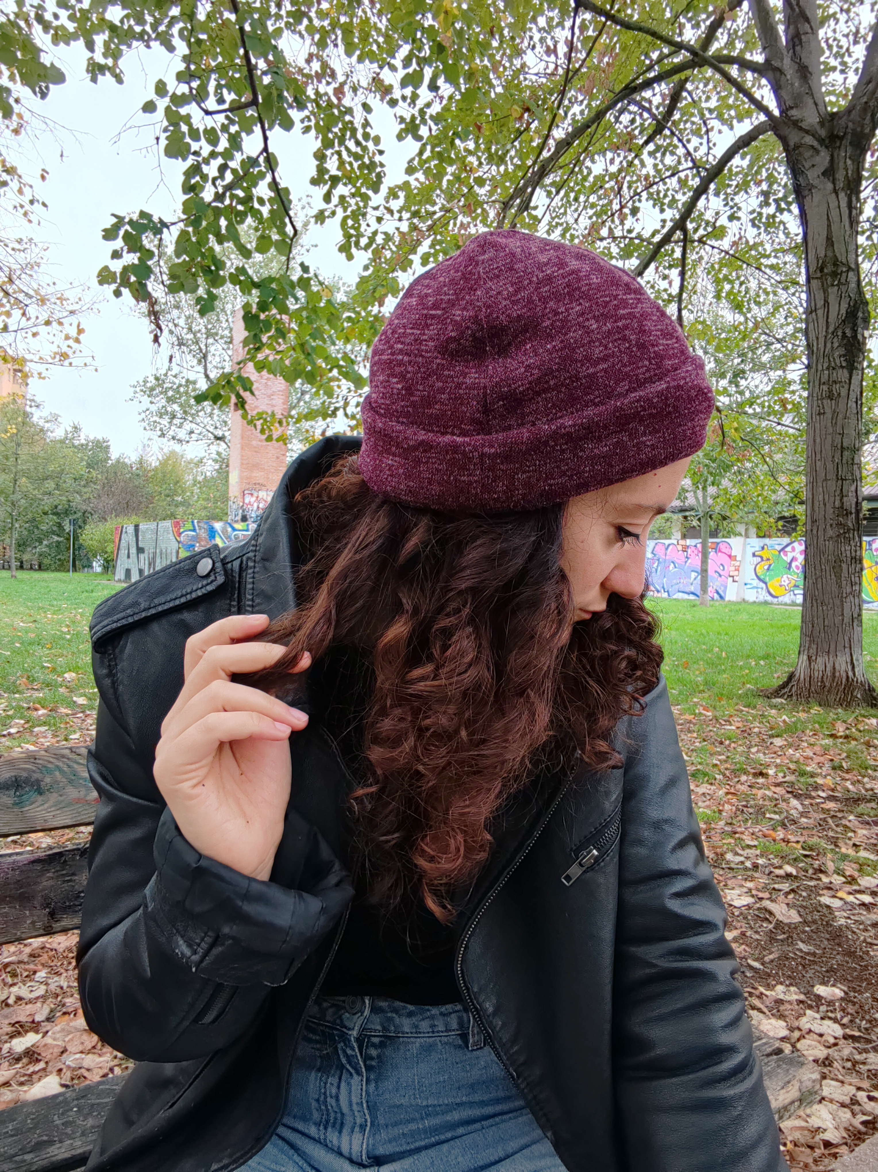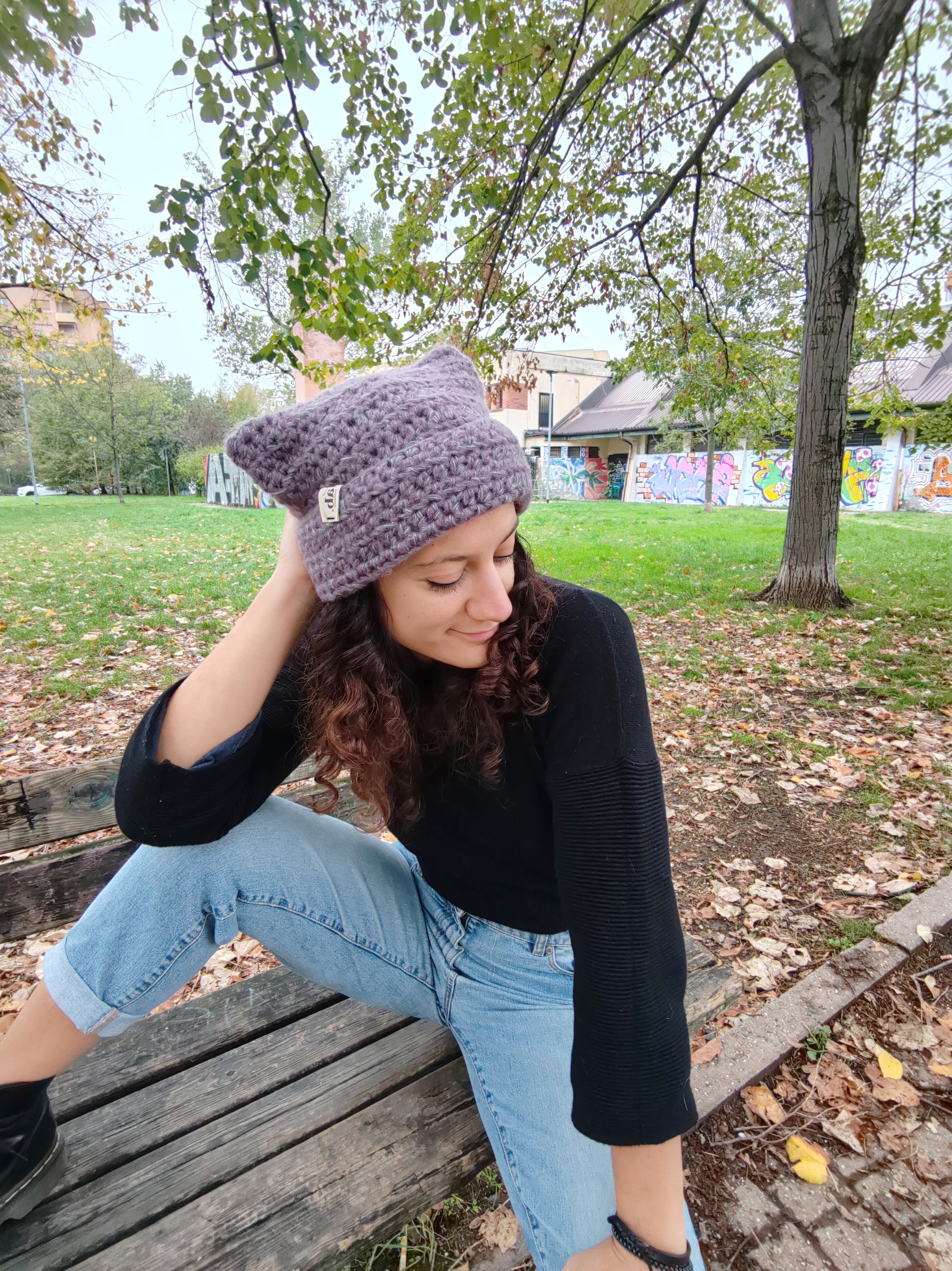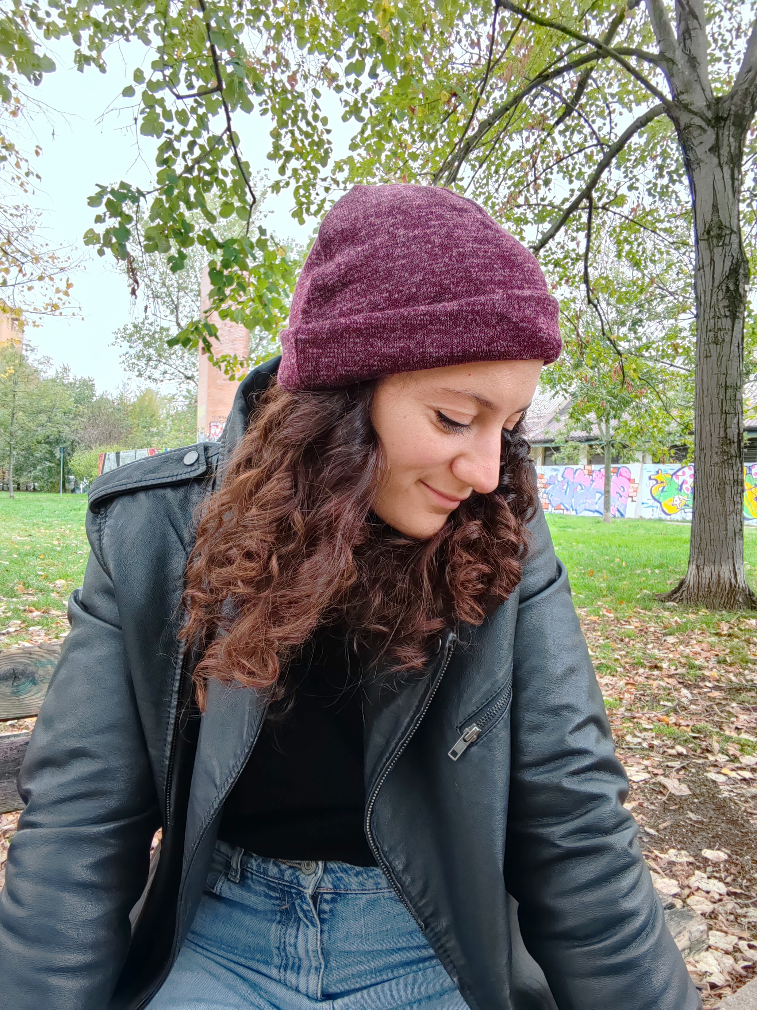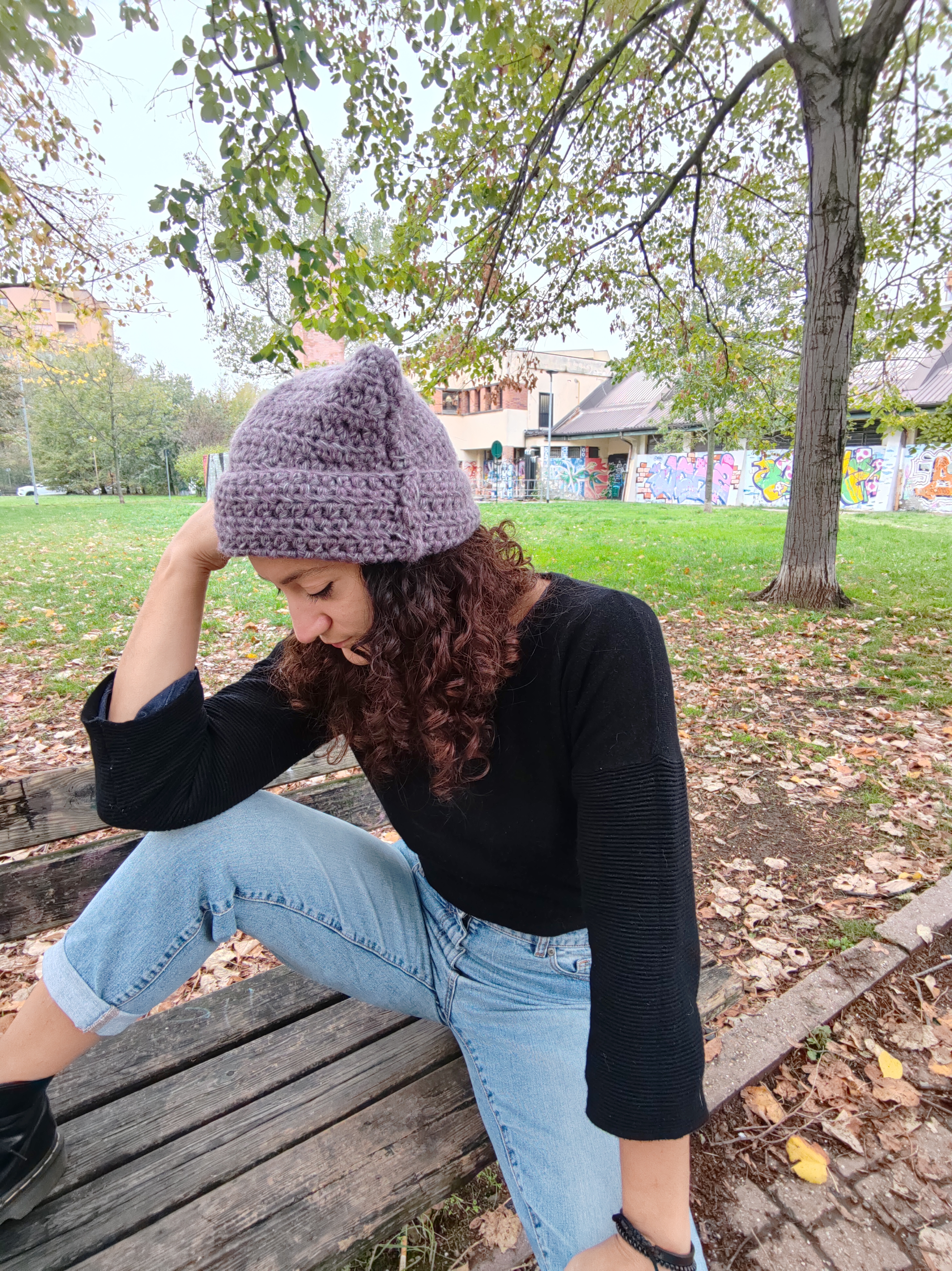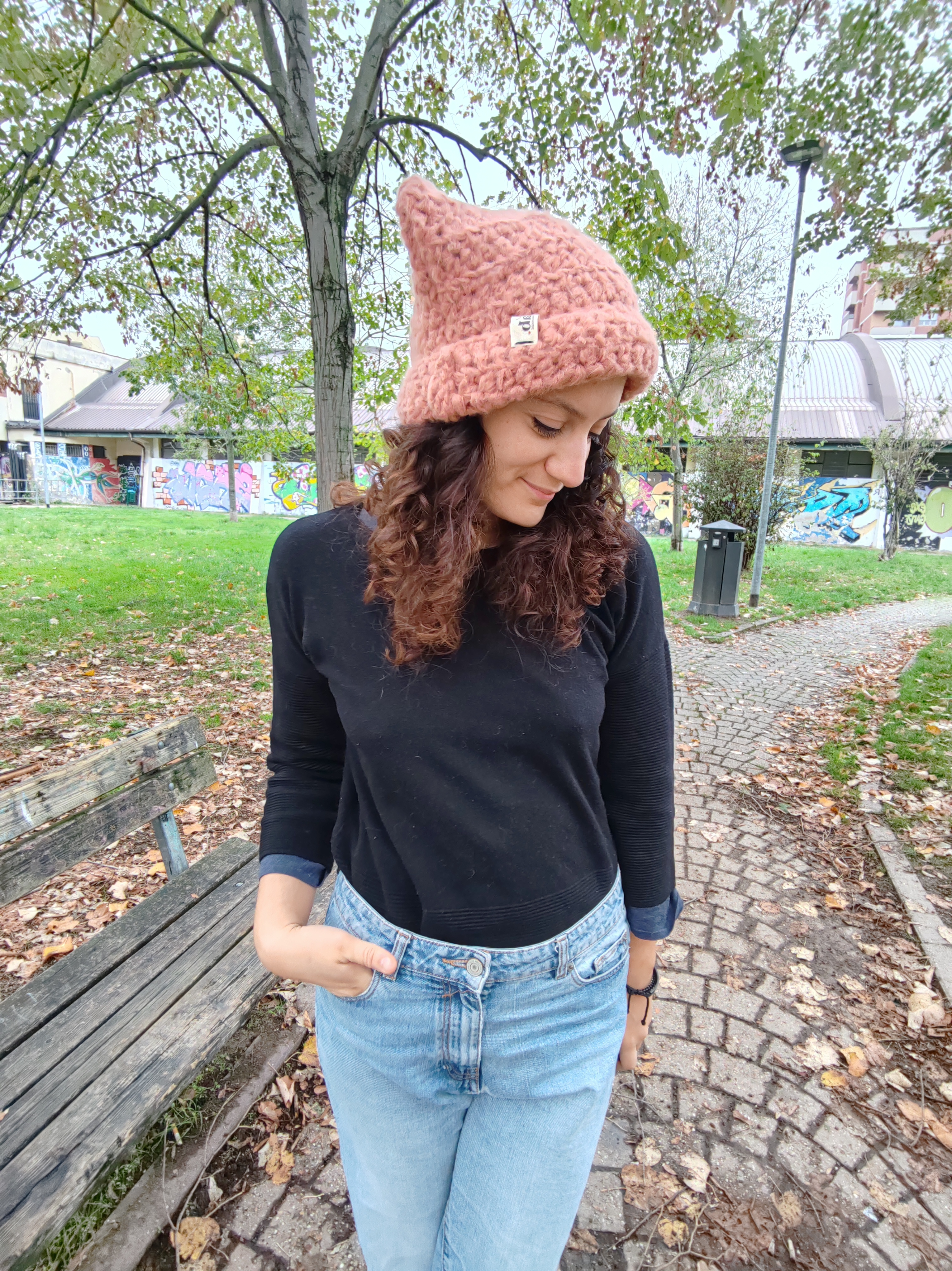 Cuffia leggermente svasata, in stile bucket. Puoi portarla con il risvolto o senza.