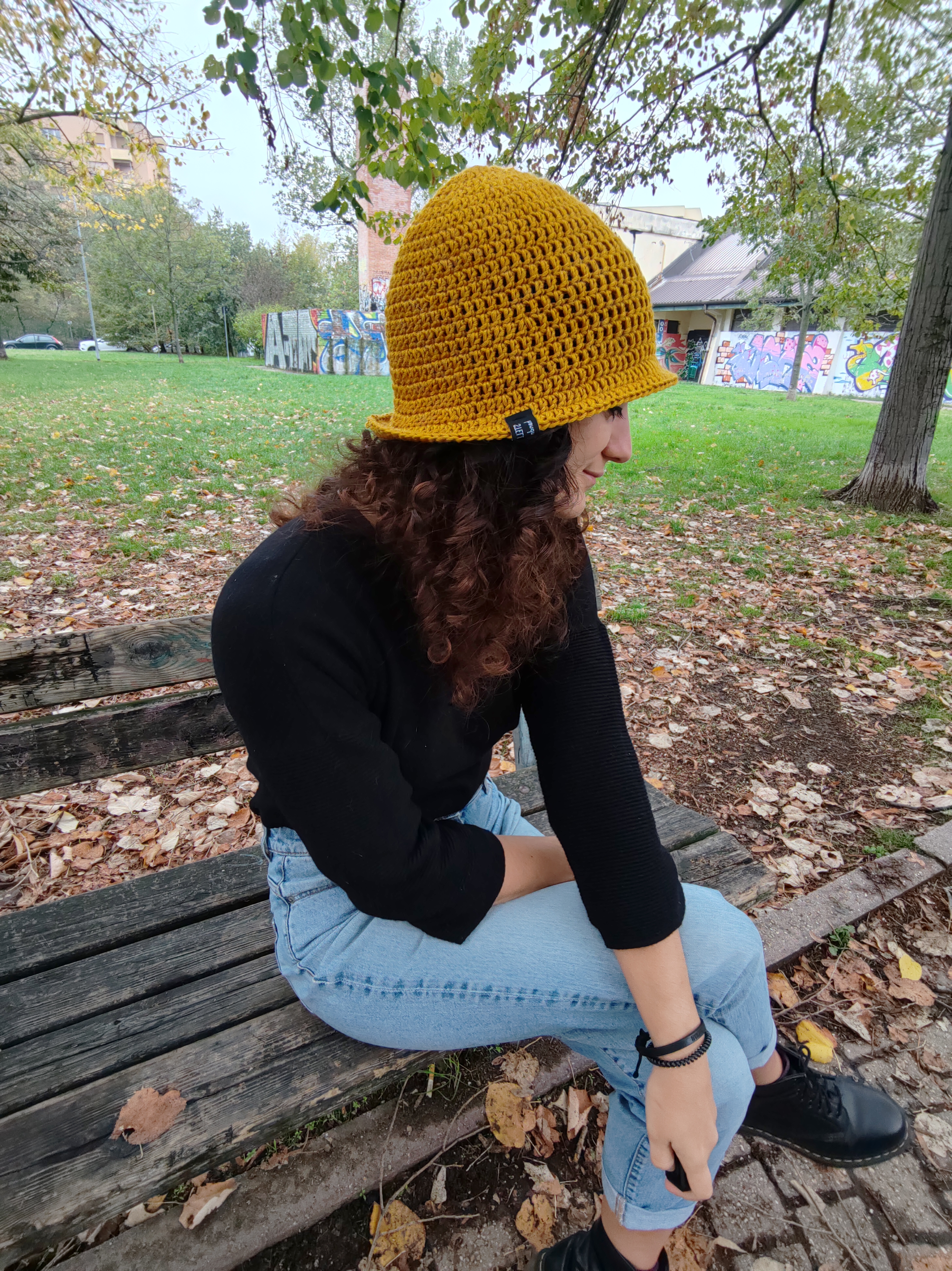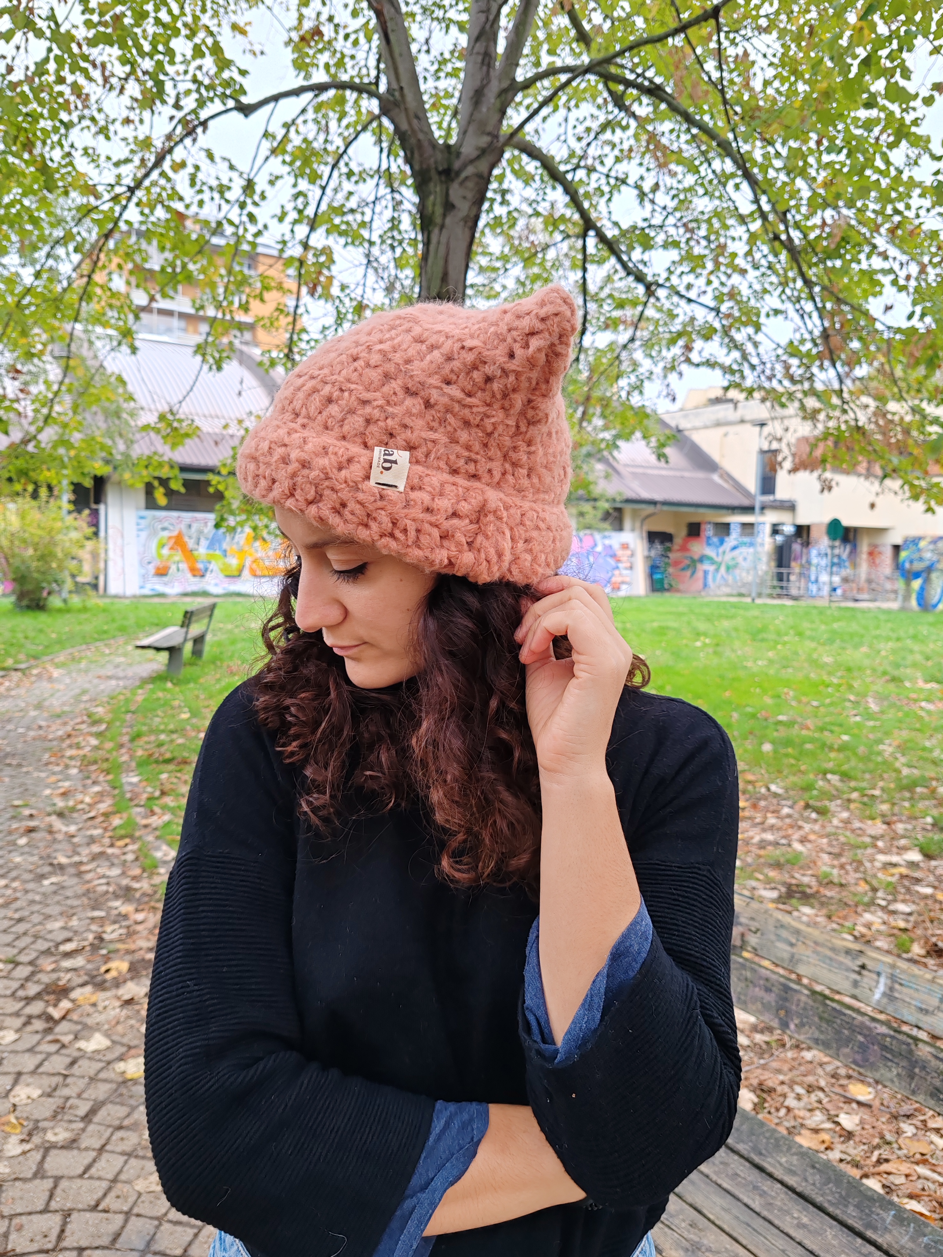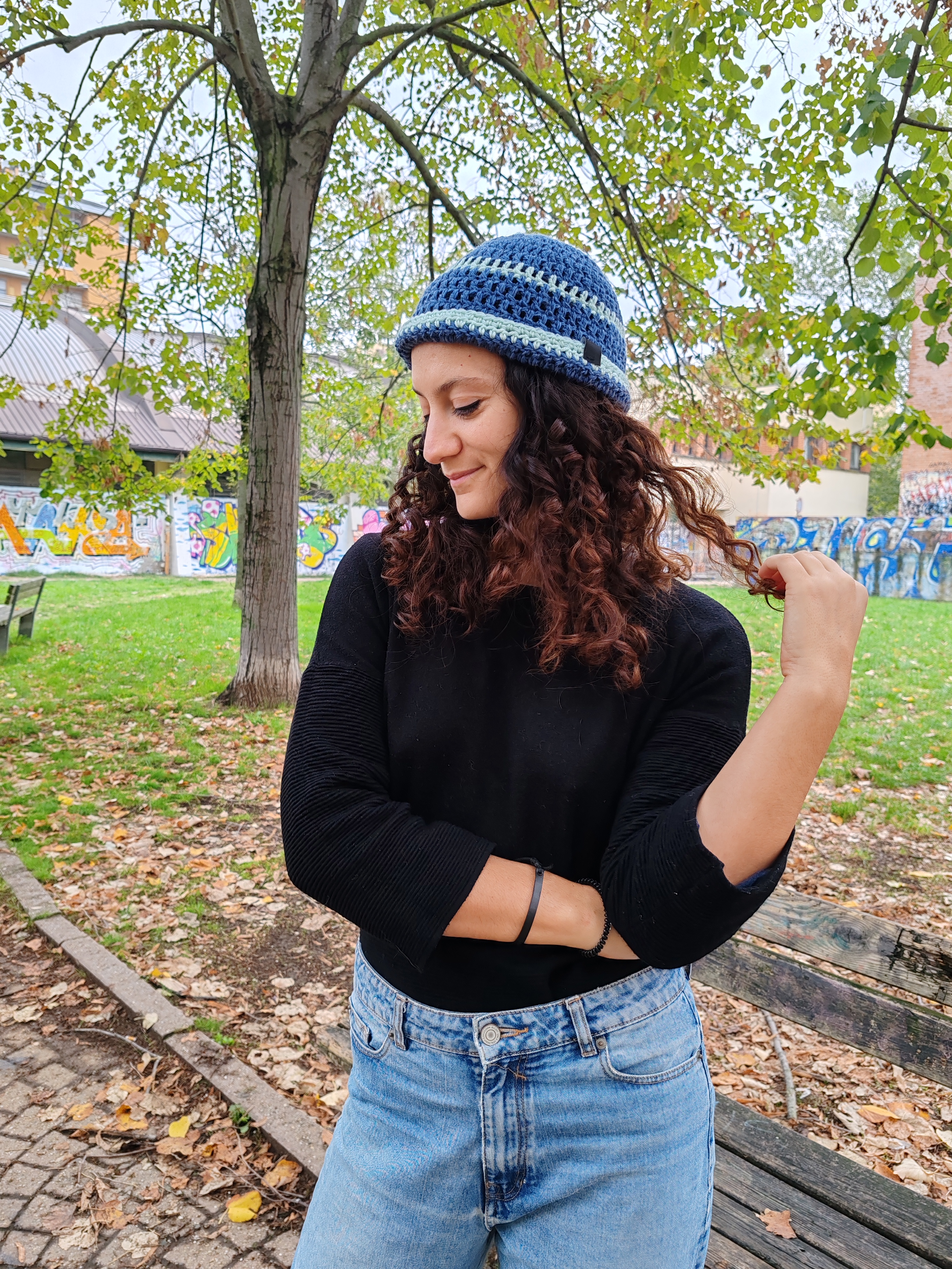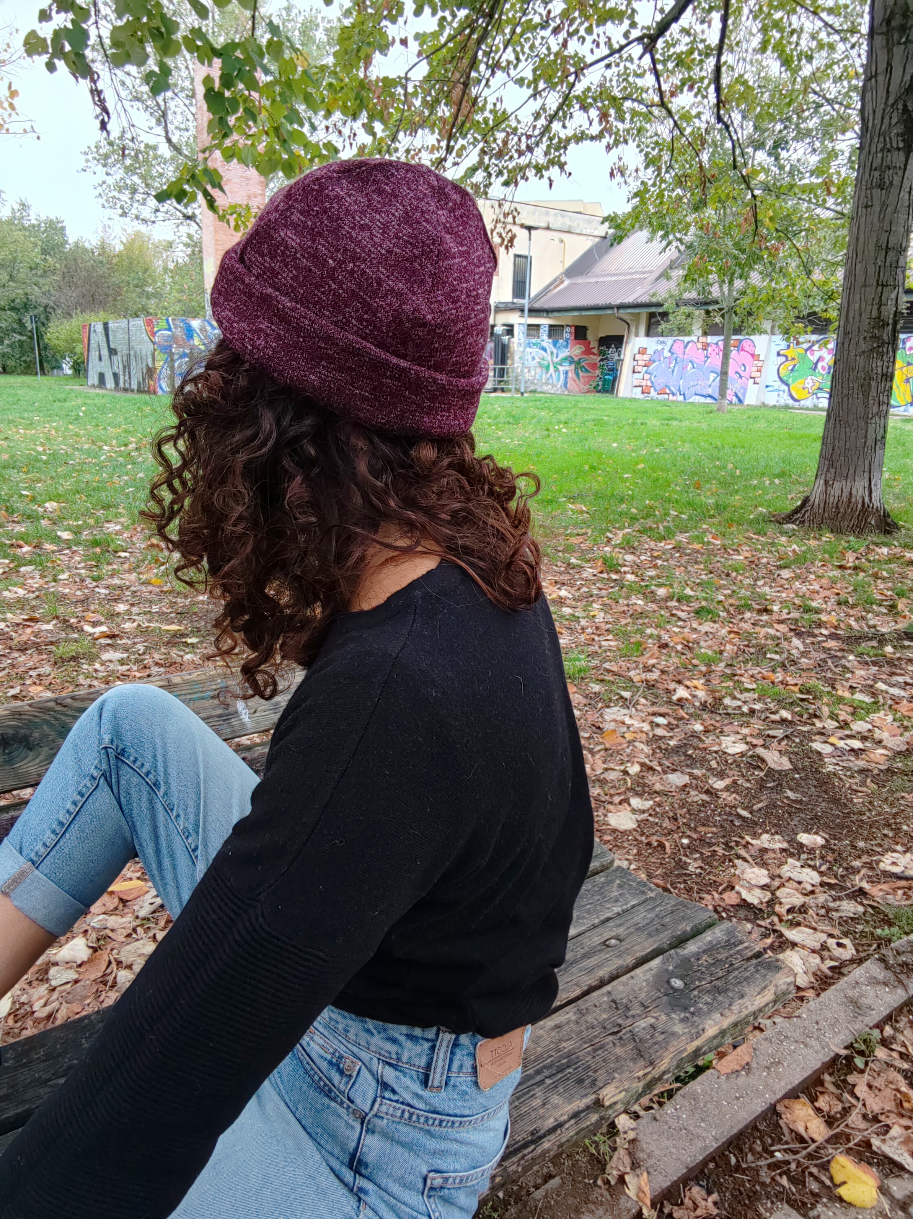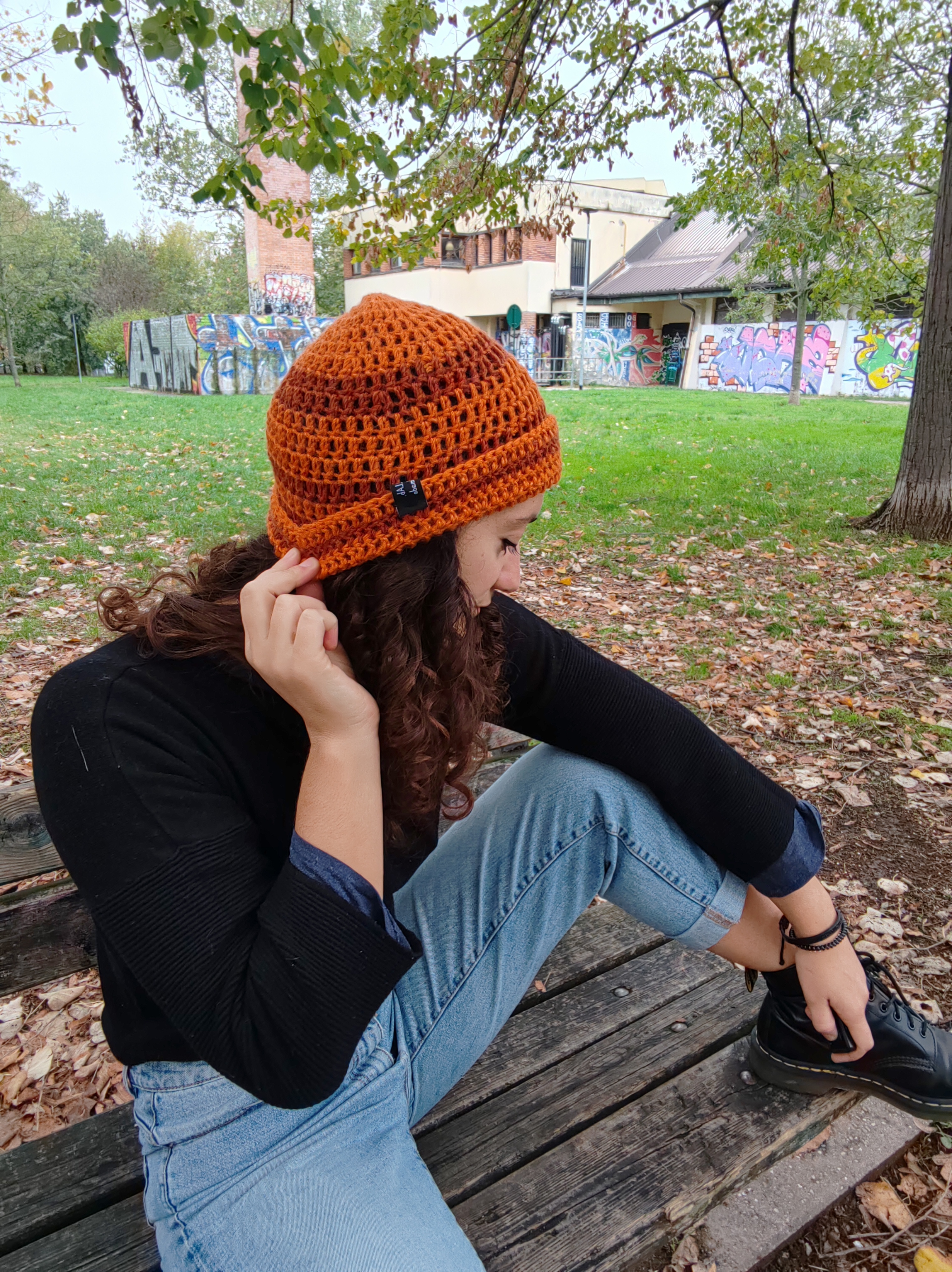 Cuffia leggermente svasata, in stile bucket. Puoi portarla con il risvolto o senza.