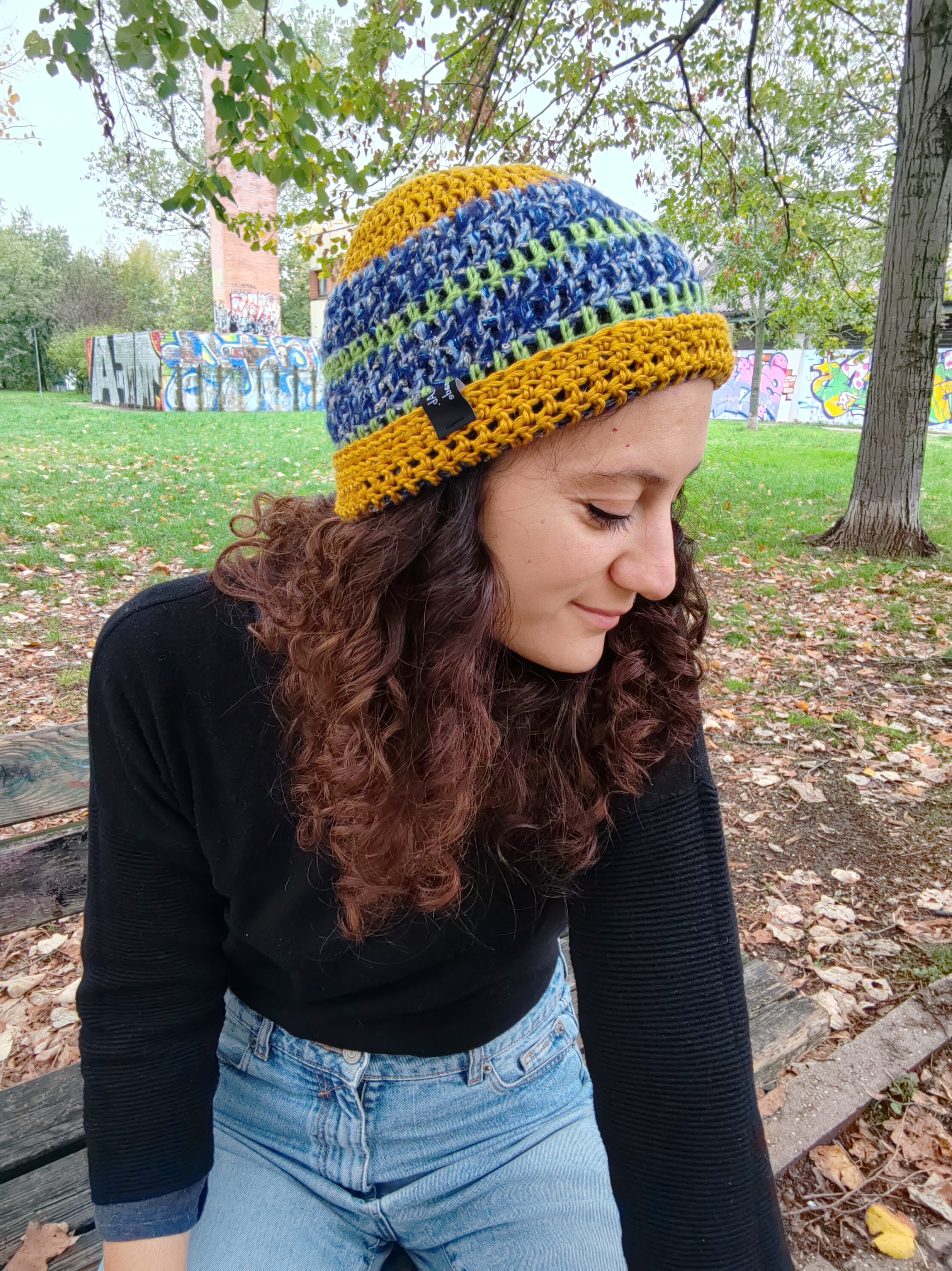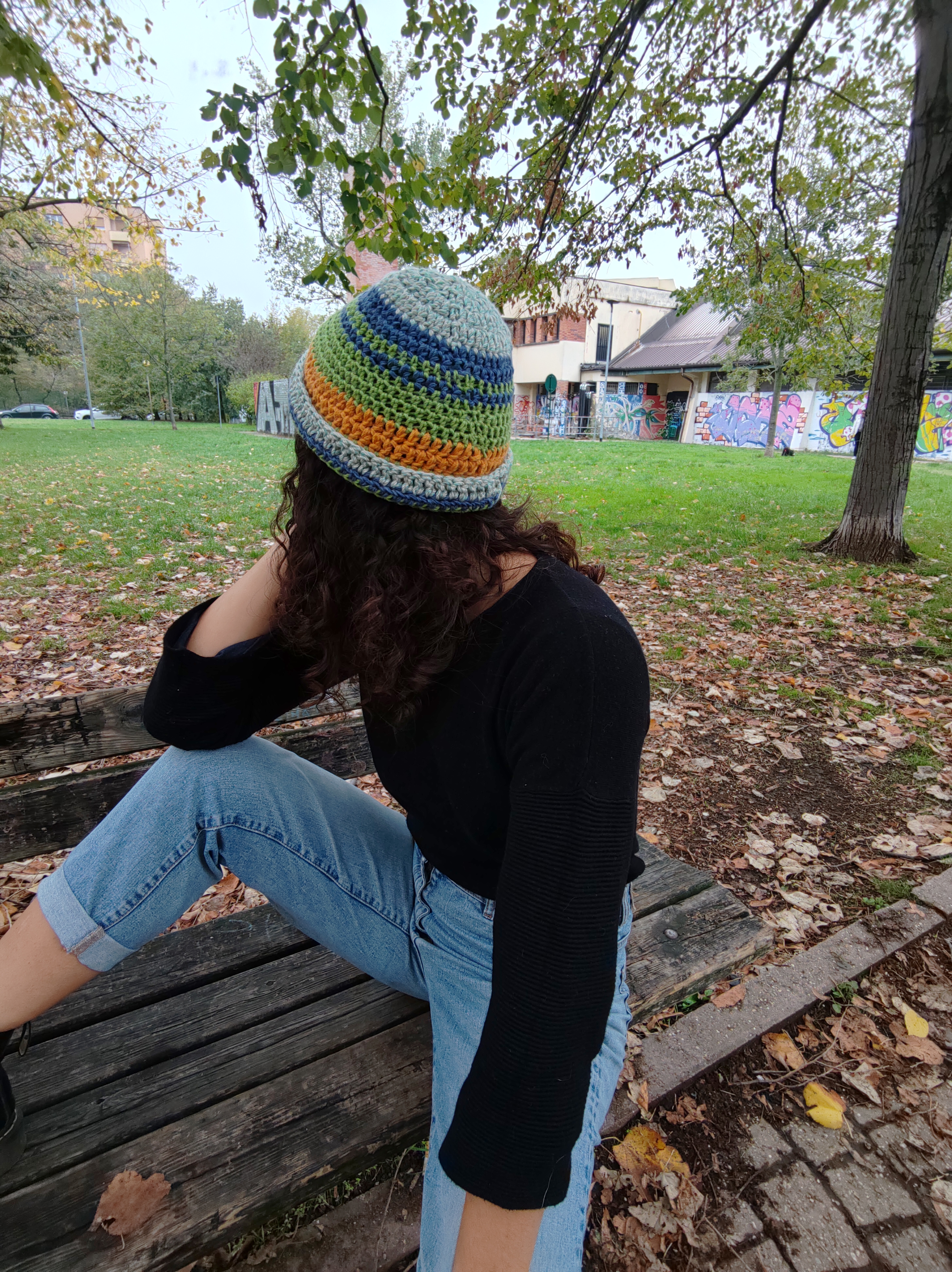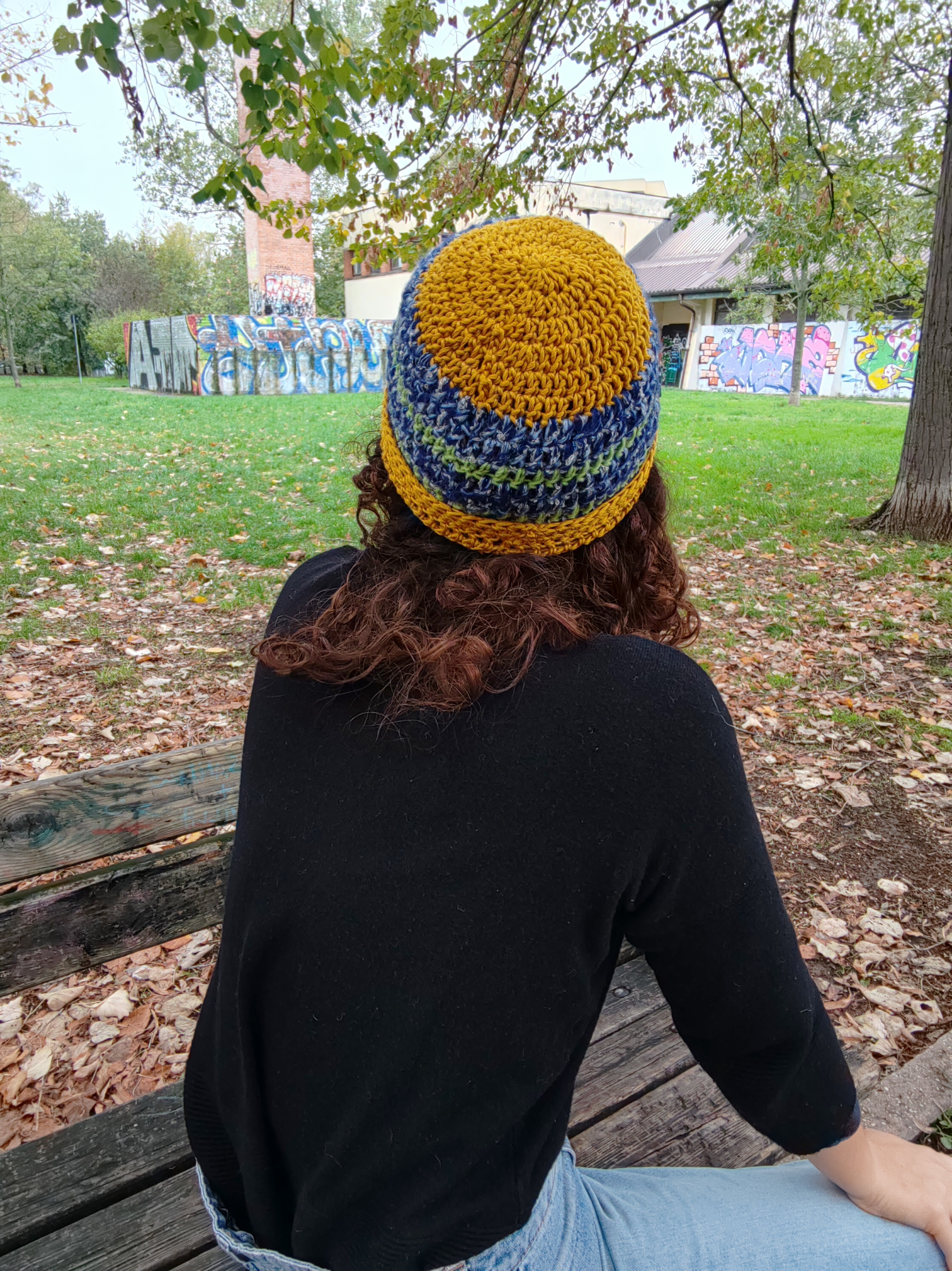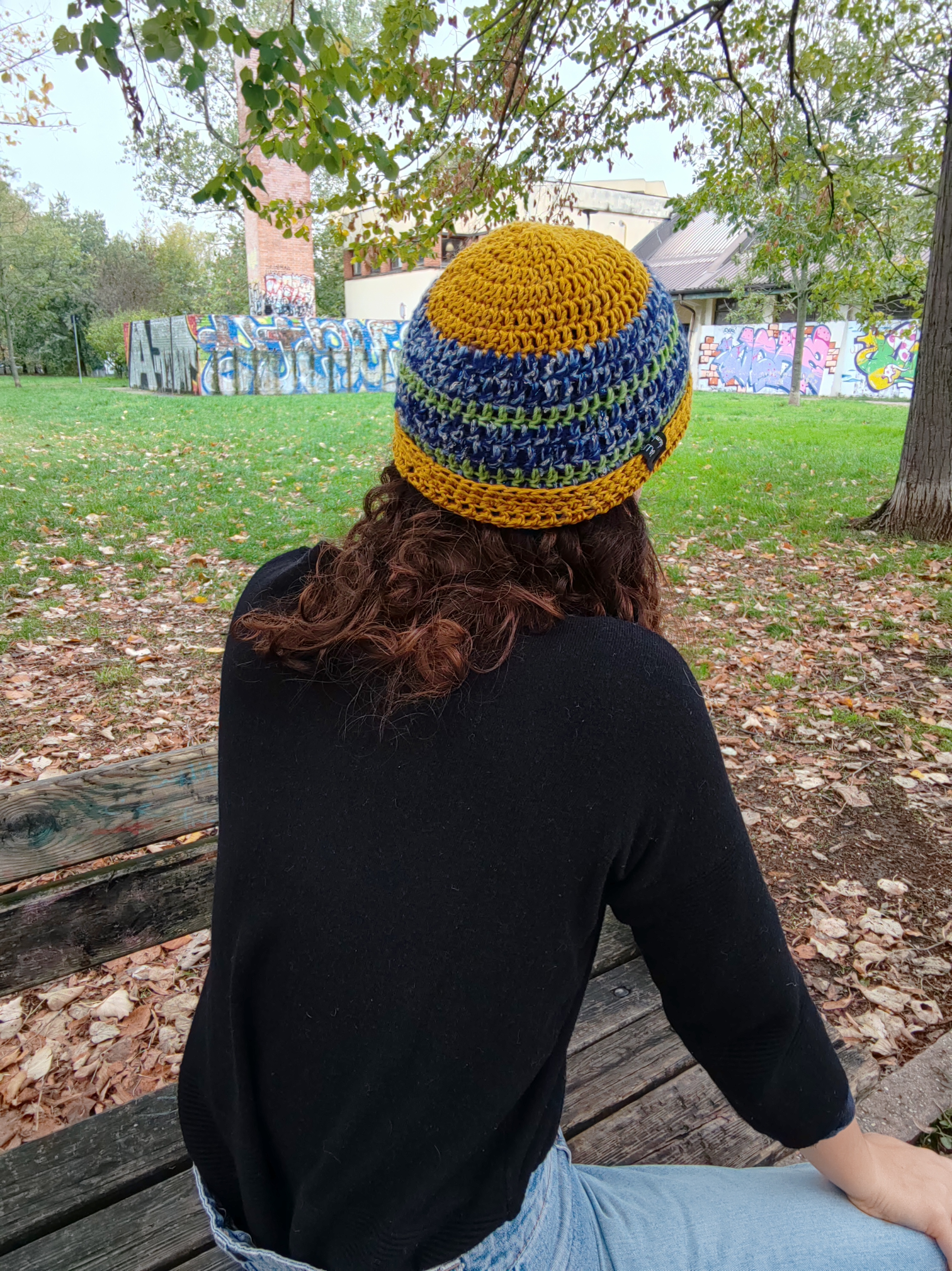 Cuffia base blu, con righe mattone, ocra, verde menta. Filati in lana.