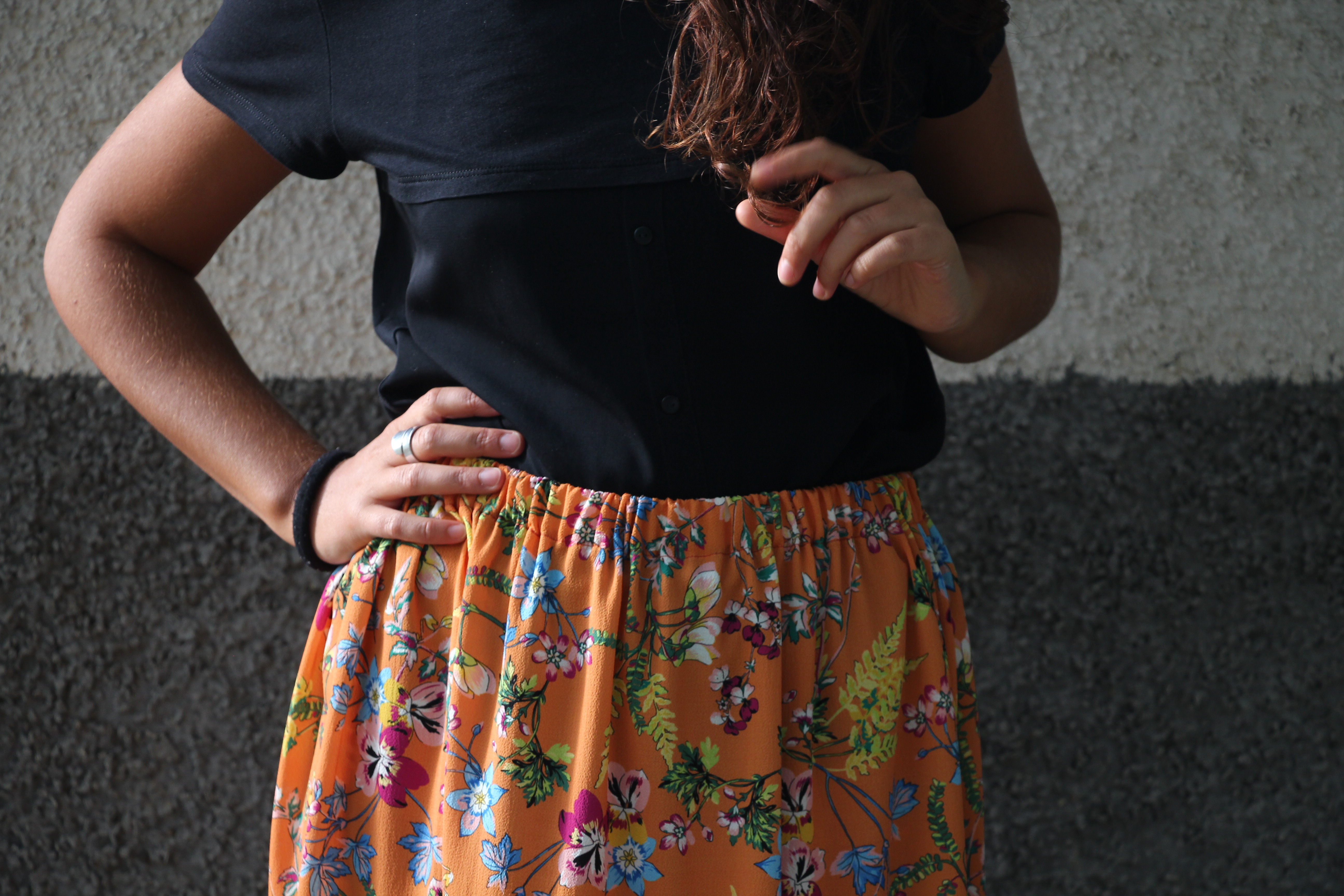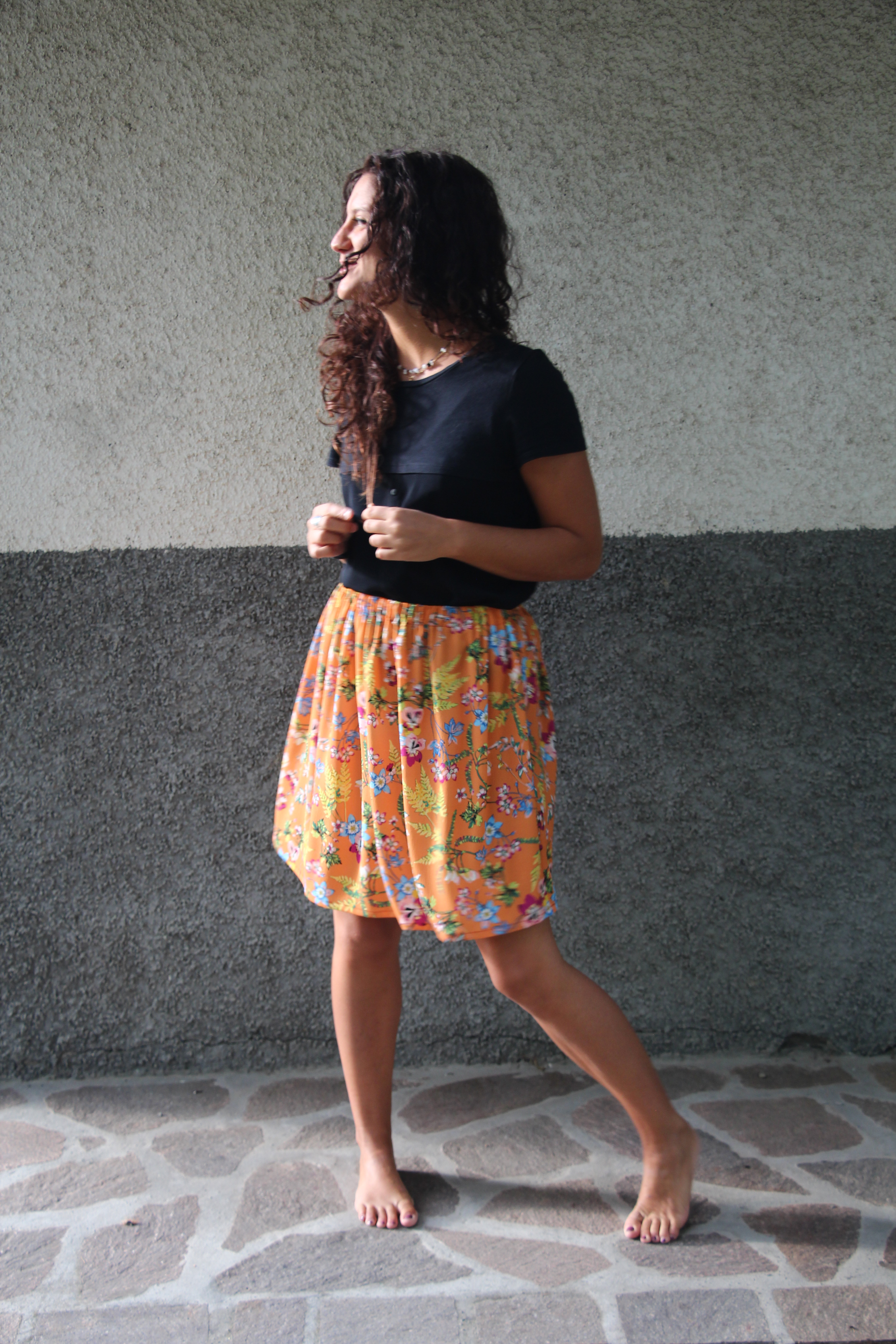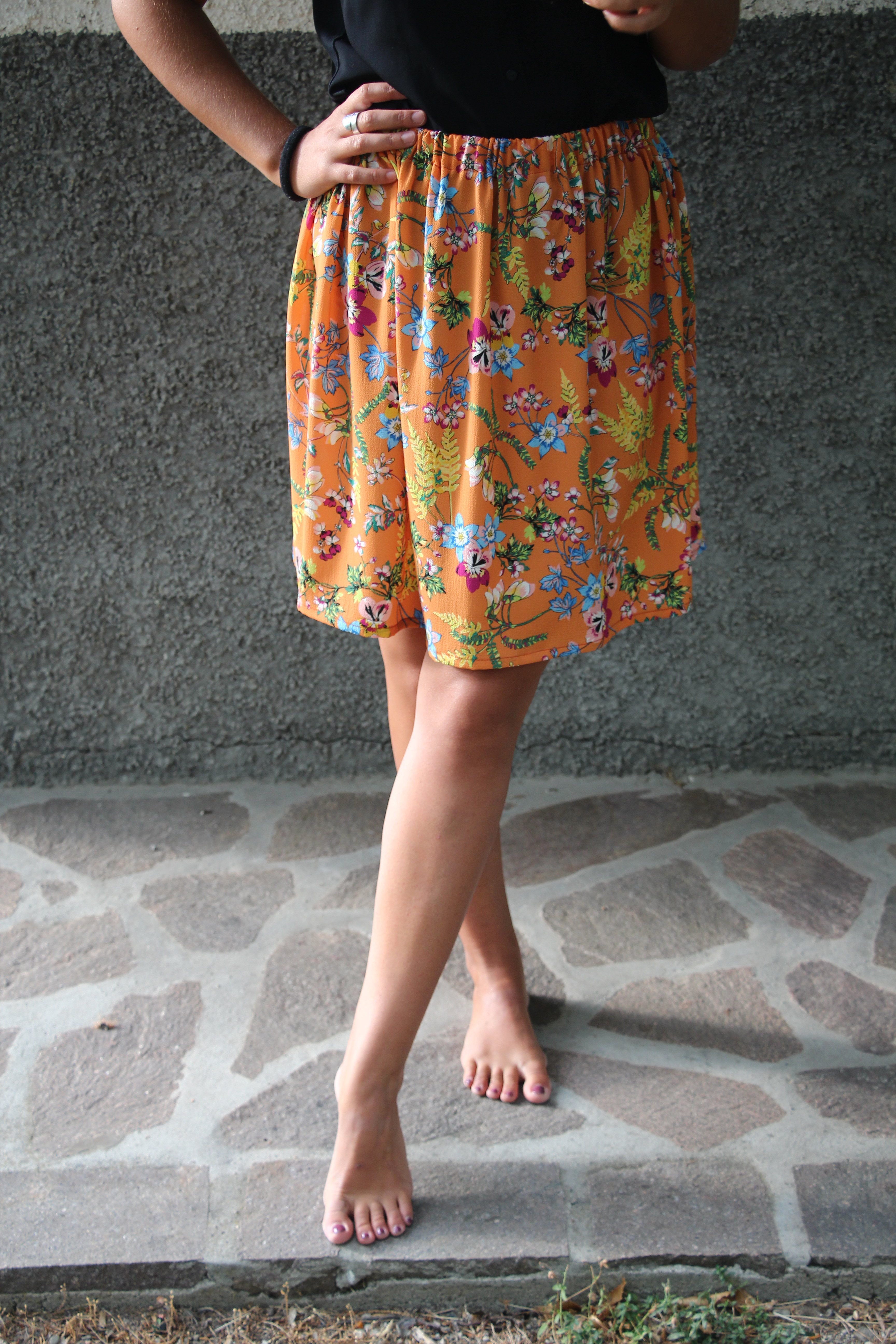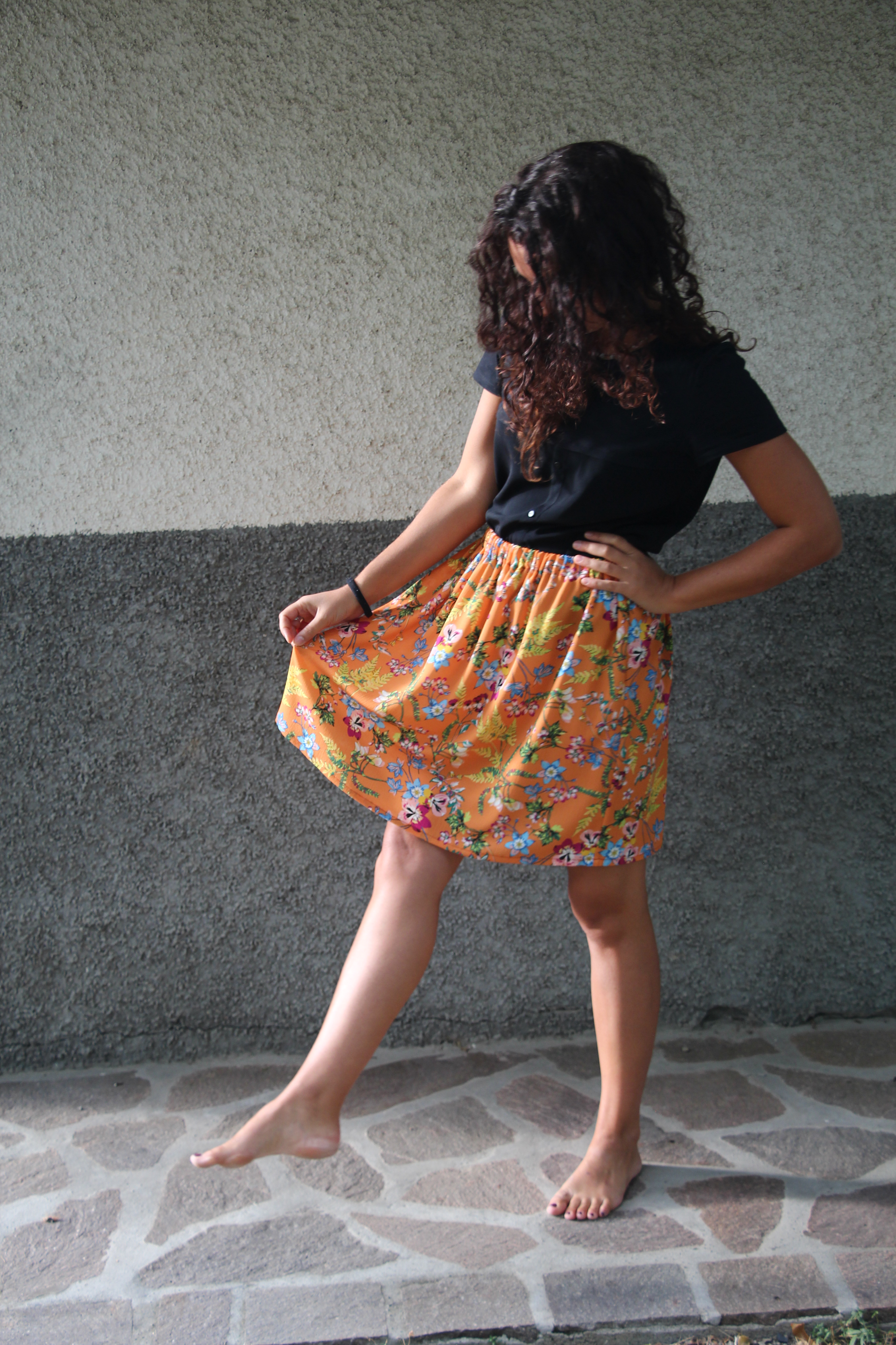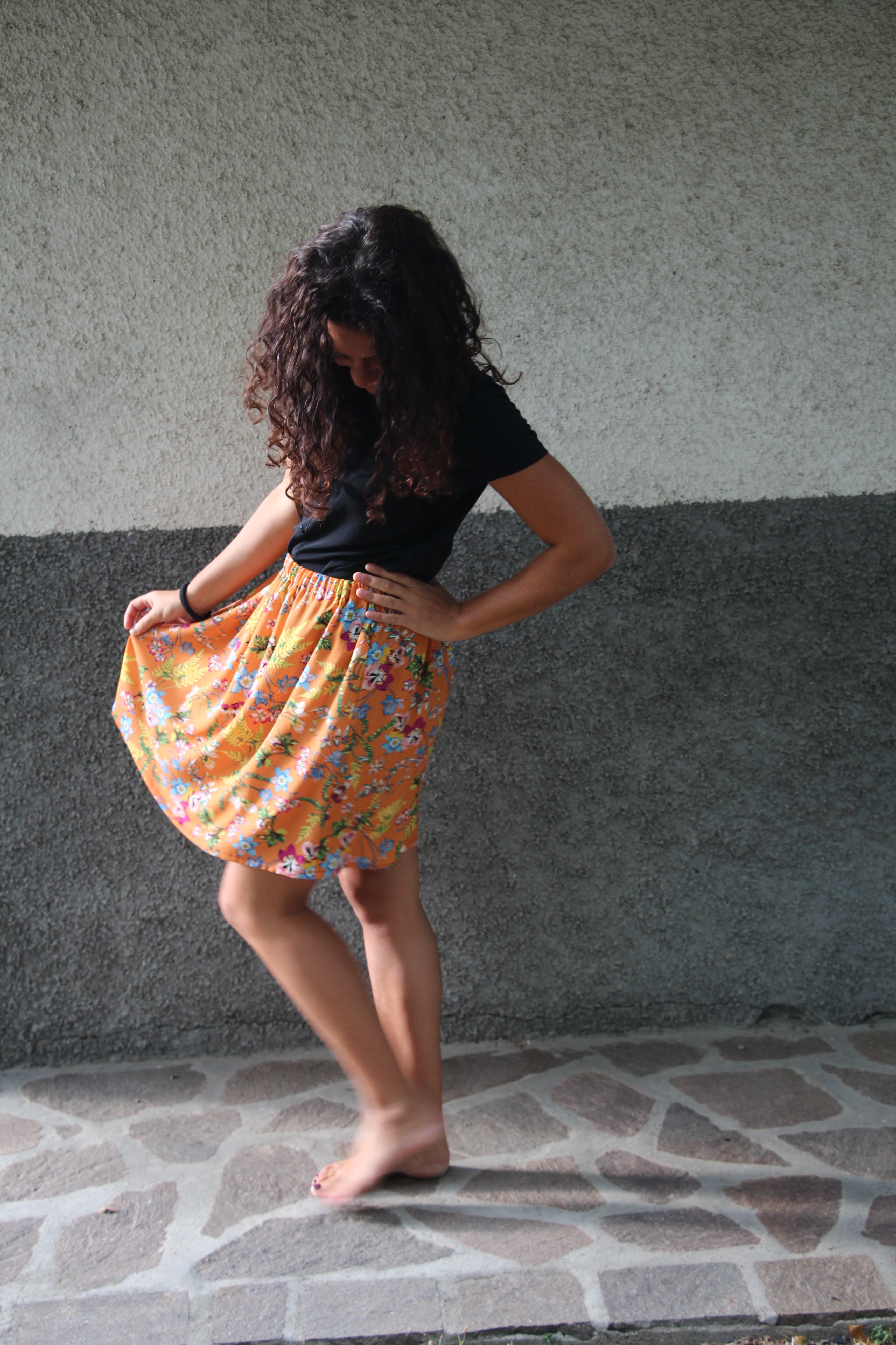 Gonna corta arricciata, fantasia fiori con base arancione. L’elastico in vita la rende comoda e adatta a più fisicità. Tessuto in viscosa.